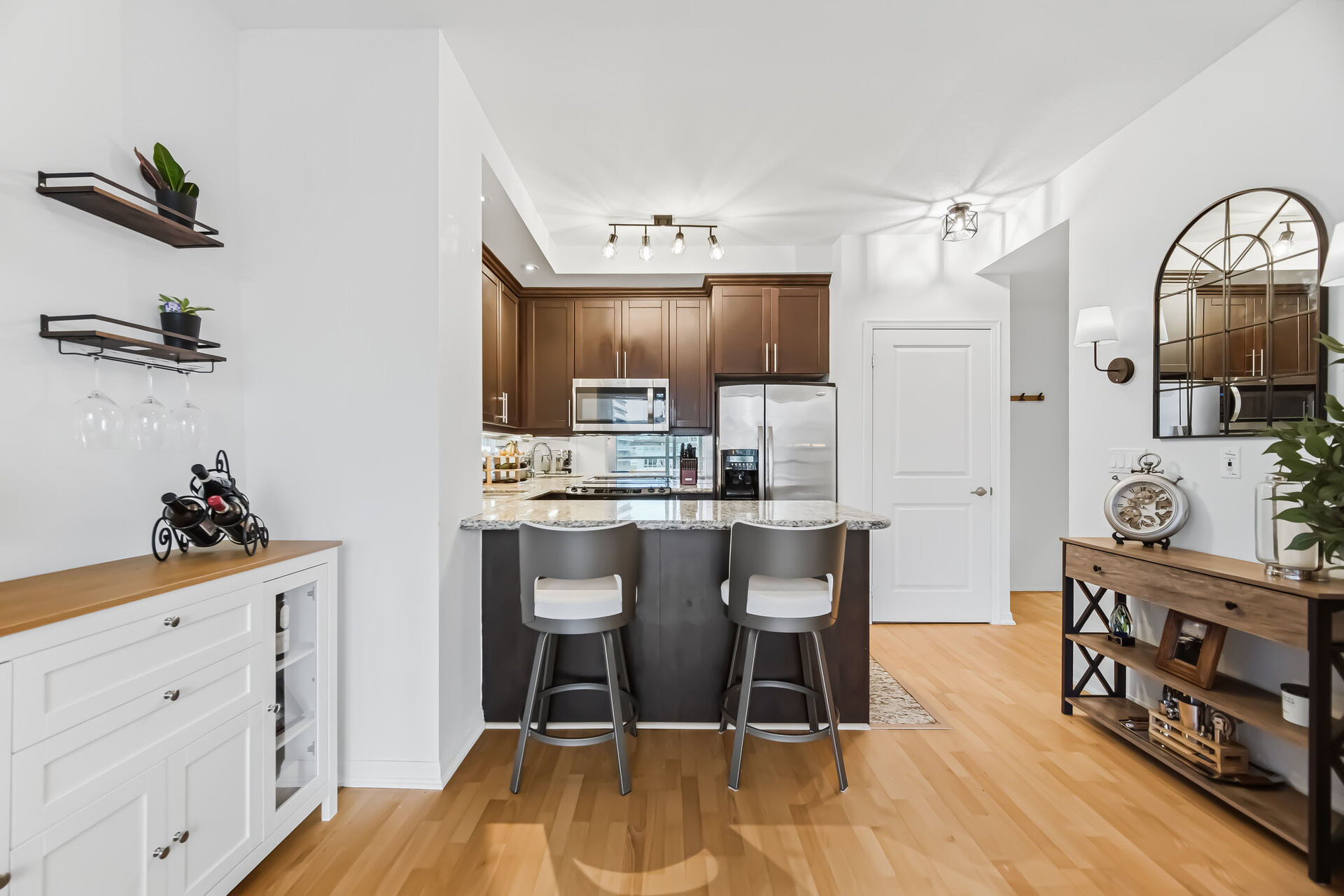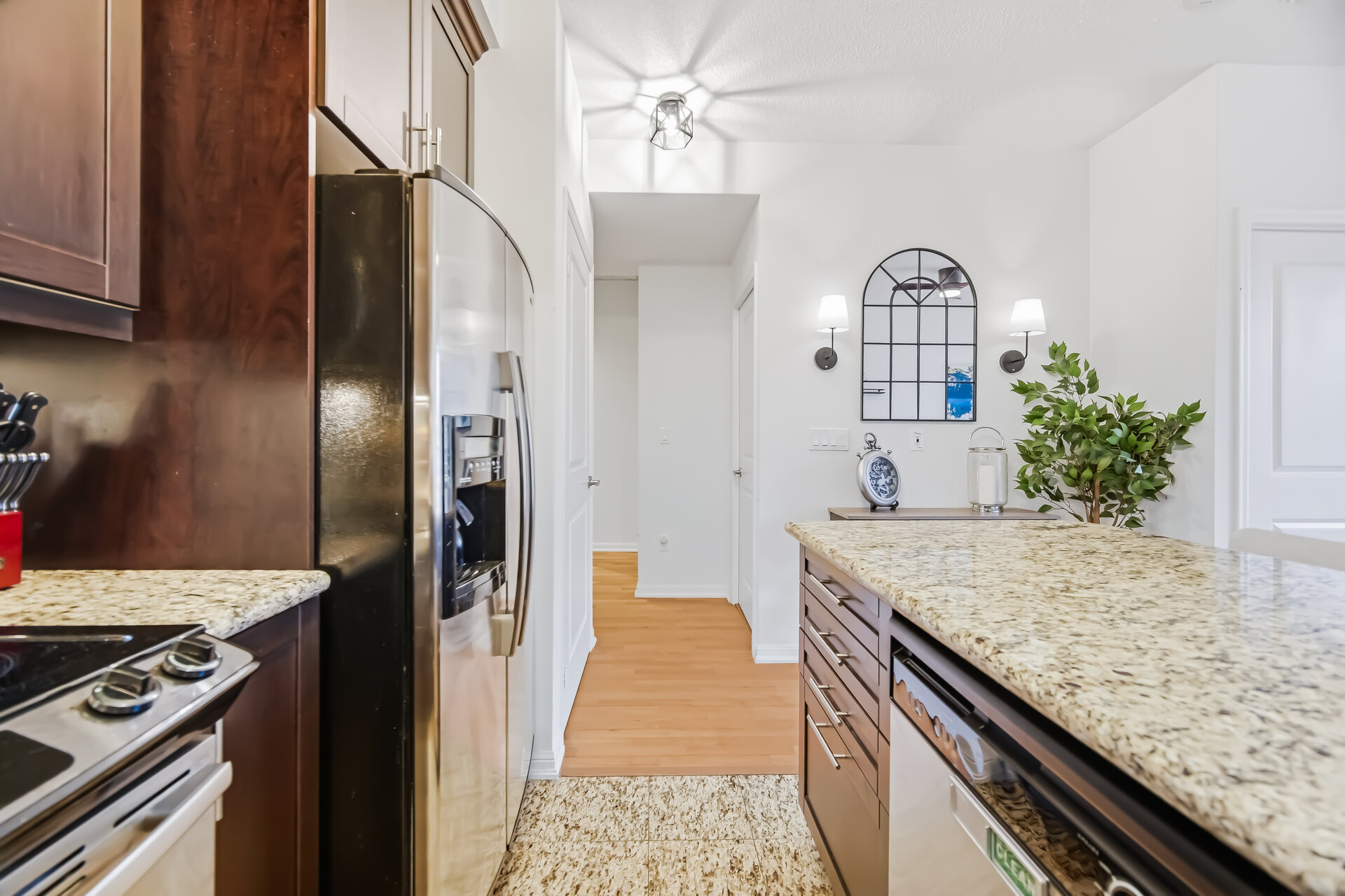 Enjoy a spacious balcony overlooking the courtyard, with convenient walk-outs from both the living area and the primary bedroom. The modern kitchen is equipped with granite countertops, a breakfast bar, premium appliances, and ample storage.